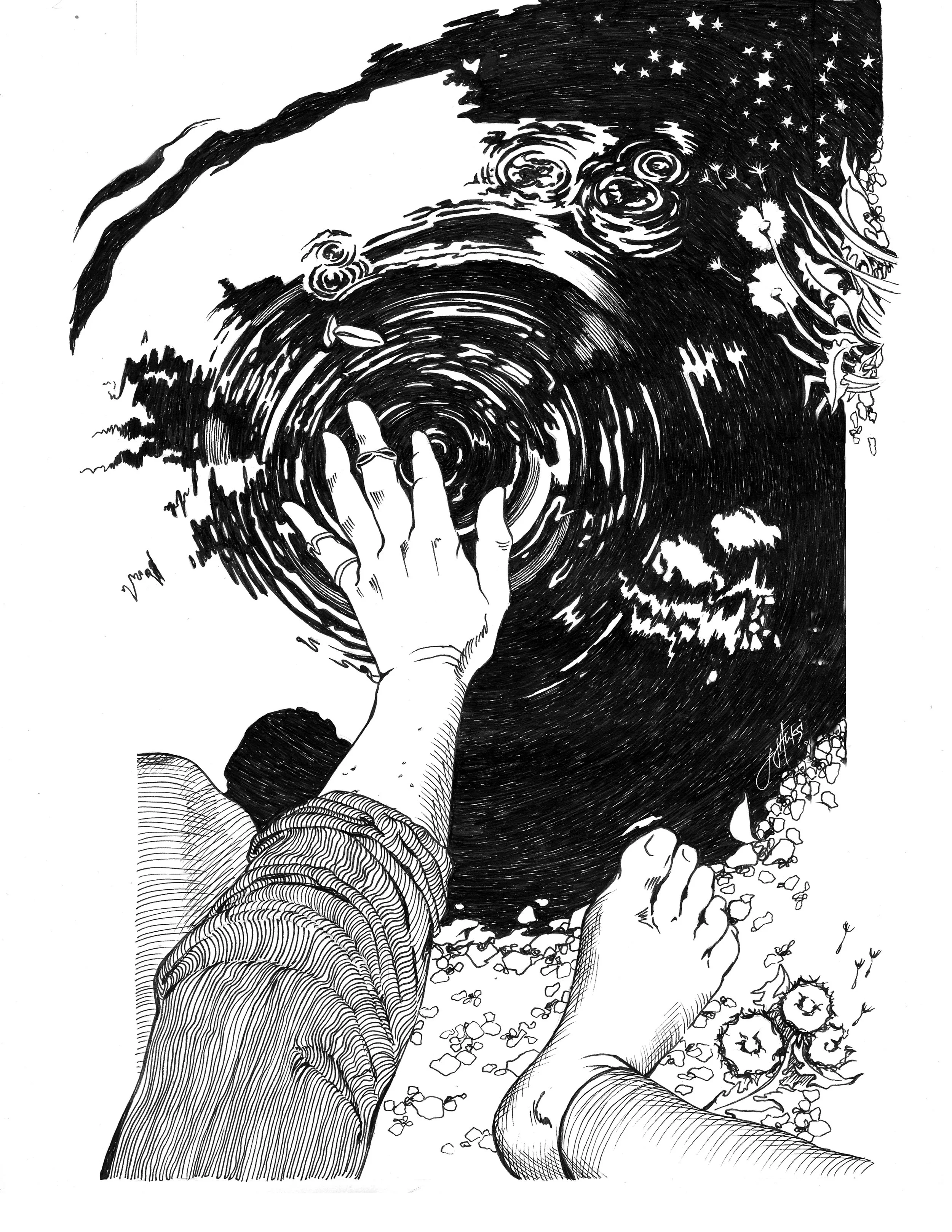 “Intuition is vital to the strength of one’s voice”. Dr. Bauman and I were discussing using a mirror to express looking inside oneself or knowing within, but rather than getting caught up on the eyes of another soul, we landed on the mirror affect of water. Water is life-giving, deep and old. This drawing is from the your perspective - bending down to touch your own reflection, circles emanating from that contact to create the reverberating halo. True knowing is with touching that deep internal part of you. Dandelion wishes frame the edges of our most childlike moments.