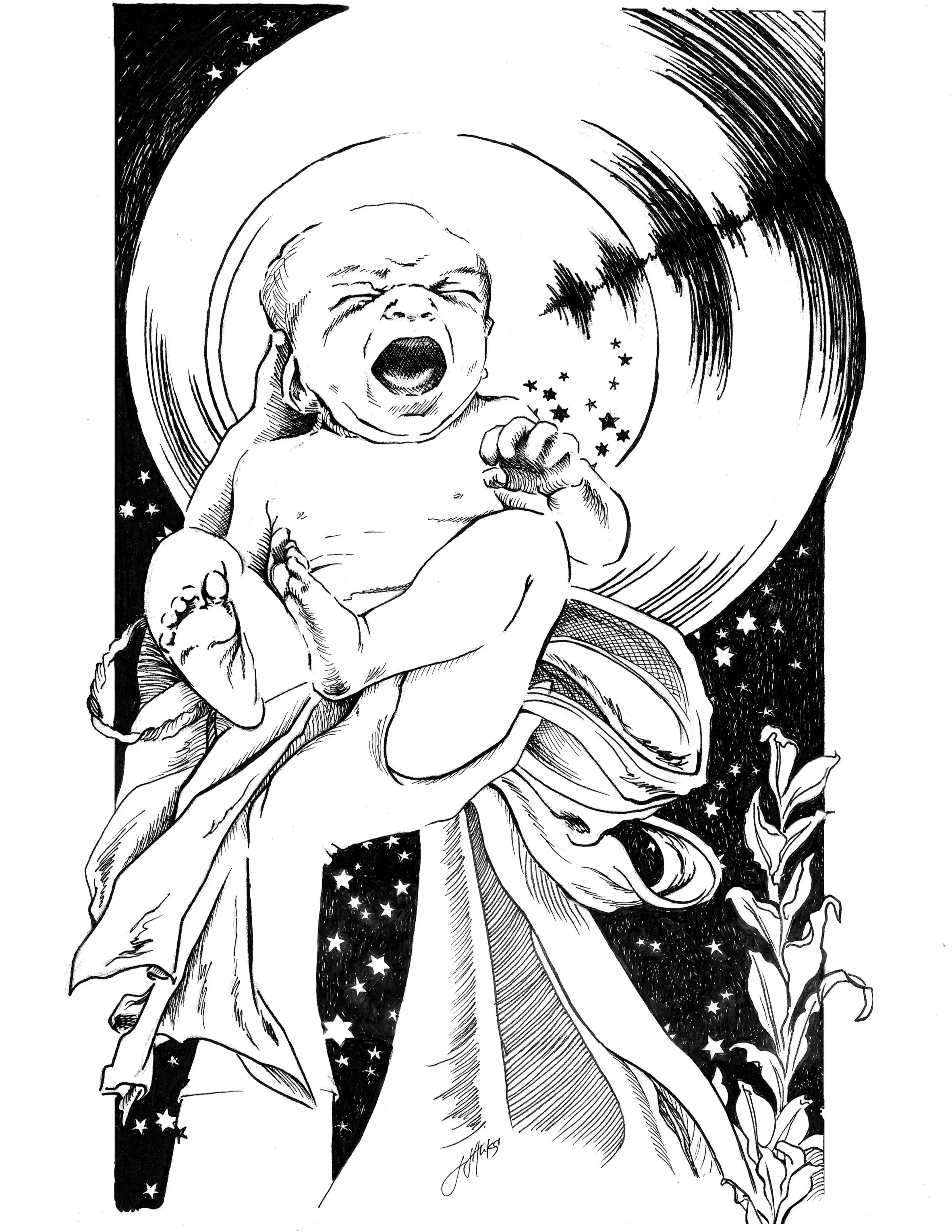 Early on our talks, we joked about the moment in The Lion King where Rafiki thrusts Simba up into the sky and the circle of life song erupts from a chorus of animals. The energy of this one reflects the moment directly from utero presented into the sky, are you, new, wet, umbilical cord still pulsating, cloth flying, and your lovely enormous cry reverberating through the night. It’s very important to have motion and these pieces I wanted you to feel the animation and really being in that moment. The moon that makes a halo around baby also backlights the sound waves erupting from its mouth.